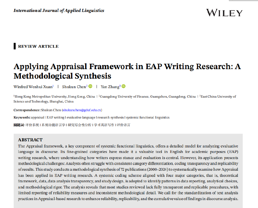 近日,外国语言与文化学院陈树坤博士以通讯作者身份在国际权威期刊International Journal of Applied Linguistics(《国际应用语言学杂志》)发表研究论文,该刊为SSCI收录语言学领域1区期刊。论文题为《Applying Appraisal Framework in EAP Writing Research: A Methodological Synthesis》(评价理论在学术英语写作研究中的应用:一项方法论综合研究),系统检视了国际学界在学术英语写作领域运用评价理论的研究方法现状。