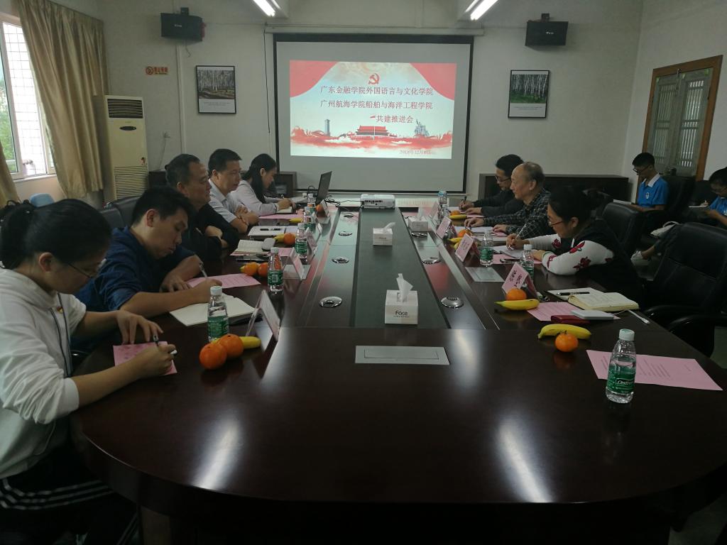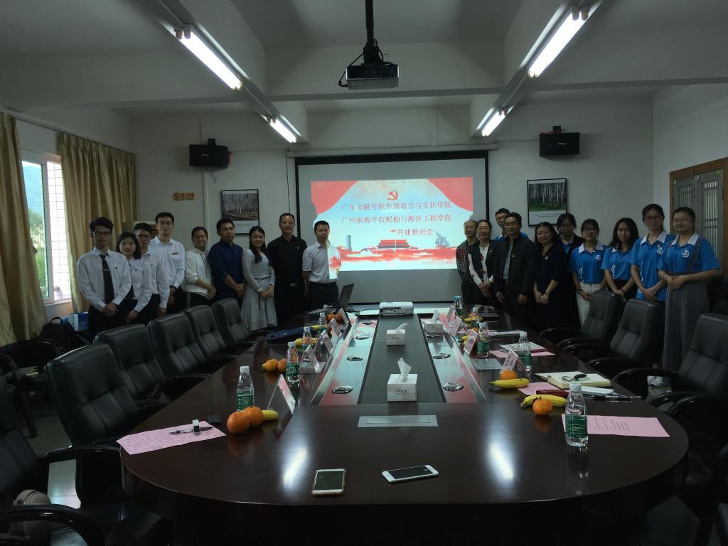 为推进“三型”党组织建设,探索创新高校学生党建工作新模式新路径,广东金融学院外国语言与文化学院与广州航海学院船舶与海洋工程学院于2018年4月27日签订党务共建协议。为巩固阶段性成果,12月4日下午,在广金外文学院会议室召开共建工作推进会,广航组织部副部长陈驰、船舶与海洋工程学院党总支书记杨应华、广金组织部副部长何承栋、外国语言与文化学院党总支书记黄晓莉、副书记李昌郴及双方学生党支部书记、辅导员均出席了本次会议。