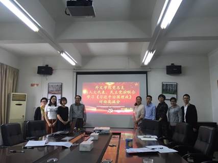 11月13日下午,外文学院党总支组织《习近平谈治国理政》新思想集体齐学共研活动,邀请天河区人大代表、学院民主党派代表共同学习《习近平谈治国理政》第二卷及其英译本的讨论交流会,以深刻领会习近平治国理政新思想和新方略。学院各民主党派教师代表先后分享了自己学习《习近平谈治国理政》第二卷及其英译本的心得体会,提出在日常教学中传播习近平新时代中国特色社会主义思想,让学生用英语说好中国故事。
