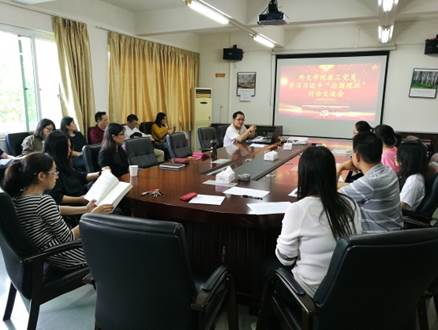 2018年11月6日,外文学院党总支在学院会议室组织教工党员老师开展学习《习近平谈治国理政》新思想讨论交流会,重点学习其中两个章节:一、“两学一做”学习教育,基础在学,关键在做;二、要有高度的文化自信。