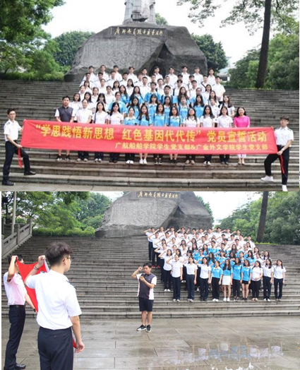为了深入学习贯彻习近平新时代中国特色社会主义思想和党的十九大精神,在中国共产党成立97周年来临之际,我校外国语言与文化学院学生党支部同广航船舶与海洋工程学院学生党支部于6月24日上午在广州起义烈士陵园举行“学思践悟新思想,红色基因代代传”预备党员宣誓仪式。