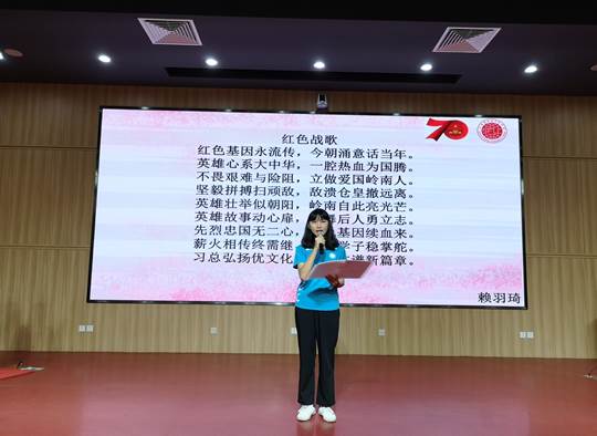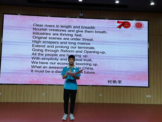 为庆祝中华人民共和国成立70周年,弘扬民族精神,缅怀革命先烈,加强爱国主义教育,外国语言与文化学院开展了主题“放飞红色梦想,唱响伟大祖国”庆祝中华人民共和国成立系列活动。举办面向外国语言与文化学院学生的作品征集,同时开展以爱国主义为中心的征文、诗歌朗诵、合唱等系列活动,营造欢乐喜庆祥和的节日氛围。