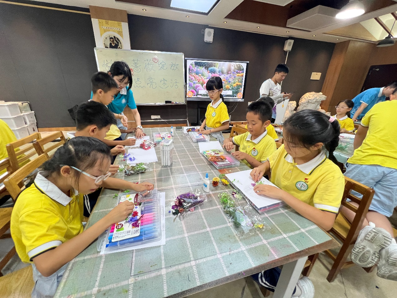 外文学院师生与广州高新区第一小学三(5)蔷薇班师生欢聚一堂,共同参与了压花艺术的学习与制作。活动中,大学生党员充分发挥自己的专业优势,用英文生动有趣地向小学生介绍各种花的英文名称。通过互动游戏和趣味问答的方式,使他们在轻松愉快的氛围中,不仅学习到了英语知识,还感受到了不同文化背景下对美的共同追求。