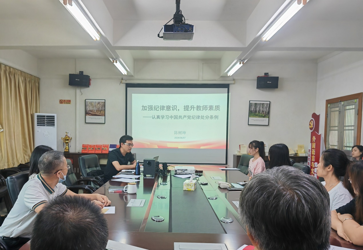 为深入学习贯彻习近平总书记关于党纪学习教育的重要讲话和重要指示精神,认真学习领会新修订的《中国共产党纪律处分条例》,按照学校党委和学院党委相关部署要求,6月7日上午,外国语言与文化学院教工第二党支部围绕《中国共产党纪律处分条例》开展党支部书记讲党纪课的活动。