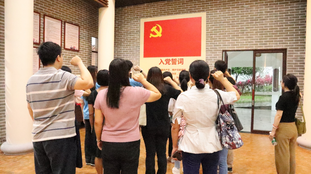 在黄庆雄书记的带领下,大家面对党旗举起右拳,一起重温入党誓词,入党誓词,是党员对党和人民做出的庄严承诺,一代又一代中国共产党人,面对鲜红党旗,右手握拳,一字一句许下铮铮誓言。