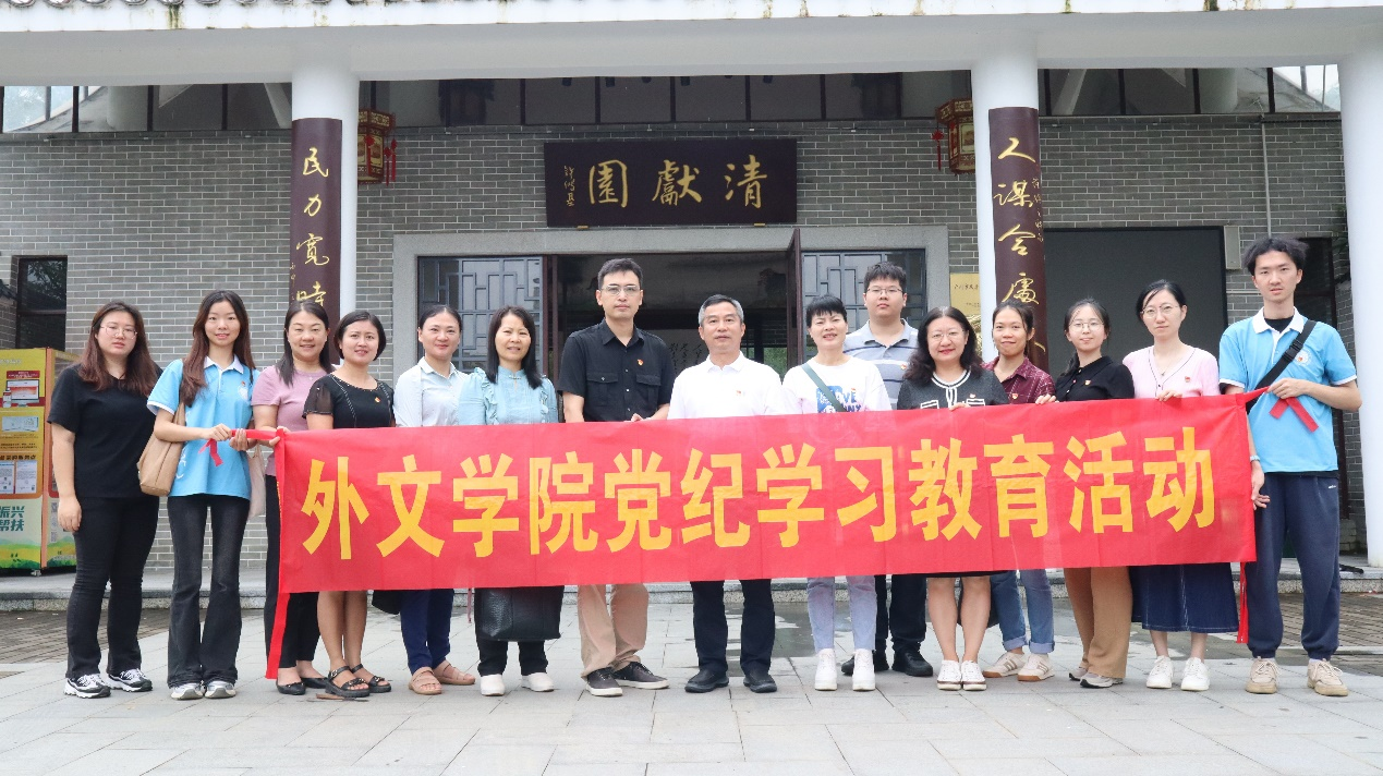 为进一步加强新时代廉洁文化建设,推进党纪学习教育走深走实,教育引导师生党员筑牢抗腐方便思想防线,真正做到“学纪、知纪、明纪、守纪”。6月14日,外国语言与文化学院党委书记黄庆雄带队赴广州市反腐倡廉教育基地——清献园开展党纪学习教育主题党日活动,院长涂兵兰、副院长陈树坤、洪溪珧、党委副书记王丹和师生党员代表一行24人随队参加活动。