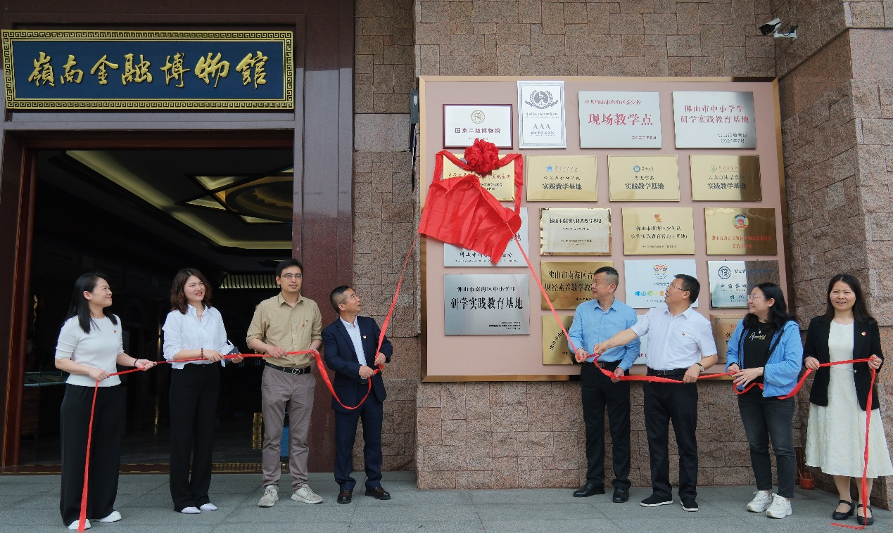 广东省文化和旅游厅博物馆与社会文物处处长颜永树、佛山市岭南金融博物馆馆长丁方忠、副馆长李士英、外国语言与文化学院党委书记黄庆雄、副院长陈树坤、洪溪珧、党委副书记王丹等领导嘉宾共同为实践基地揭幕。红绸掀开的一刻,标志着广东金融学院外国语言与文化学院与佛山市岭南金融博物馆在思政教育、文化传承领域的合作迈向新高度。