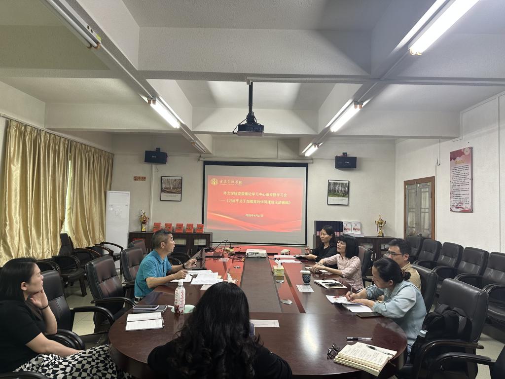 为贯彻落实《中共中央办公厅关于在全党开展深入贯彻中央八项规定精神学习教育的通知》和学校党委部署要求及学院学习教育实施方案,4月27日上午,外国语言与文化学院在学院2417会议室召开了学院党委理论学习中心组专题学习会,深入学习领会中央八项规定及其实施细则精神和《习近平关于加强党的作风建设的论述摘编》。