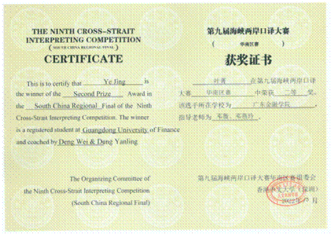 外国语言与文化学院19级学生叶菁(191598115)于2022年10月23日代表广东金融学院参加了线上进行的第九届“海峡两岸口译大赛”华南区赛。本次区赛选手来自广东、福建、海南、广西四个省份,参赛16所高校中包括华南理工大学、华南师范大学、暨南大学、广东外语外贸大学、深圳大学、海南大学、广西大学、福建师范大学等省内外著名高校。我校选手在第一轮淘汰赛中以出色表现晋级决赛,并最终取得二等奖的好成绩。