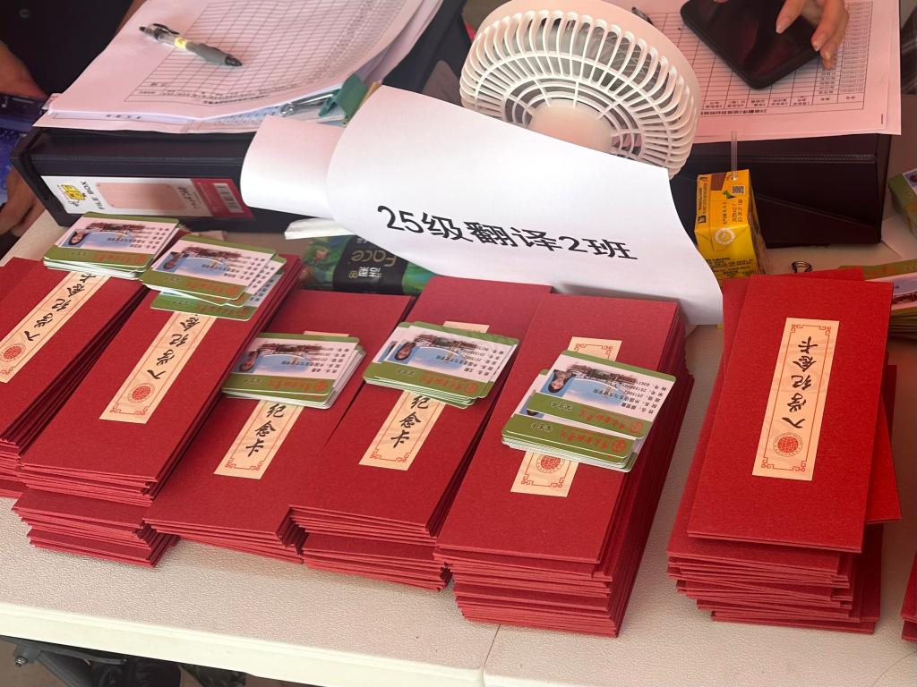 在迎新现场,学院为2025级新生准备的定制入学纪念卡,成为一道独特的风景线。卡片设计匠心独运,既饱含着学院的人文关怀,又寄托着对新同学的美好期许。它如同钥匙,开启了25级新生们在外国语言与文化学院的全新求学之旅,寓意着他们将在这片知识的沃土中汲取养分,茁壮成长,勇敢迎接未来的无限可能与挑战。