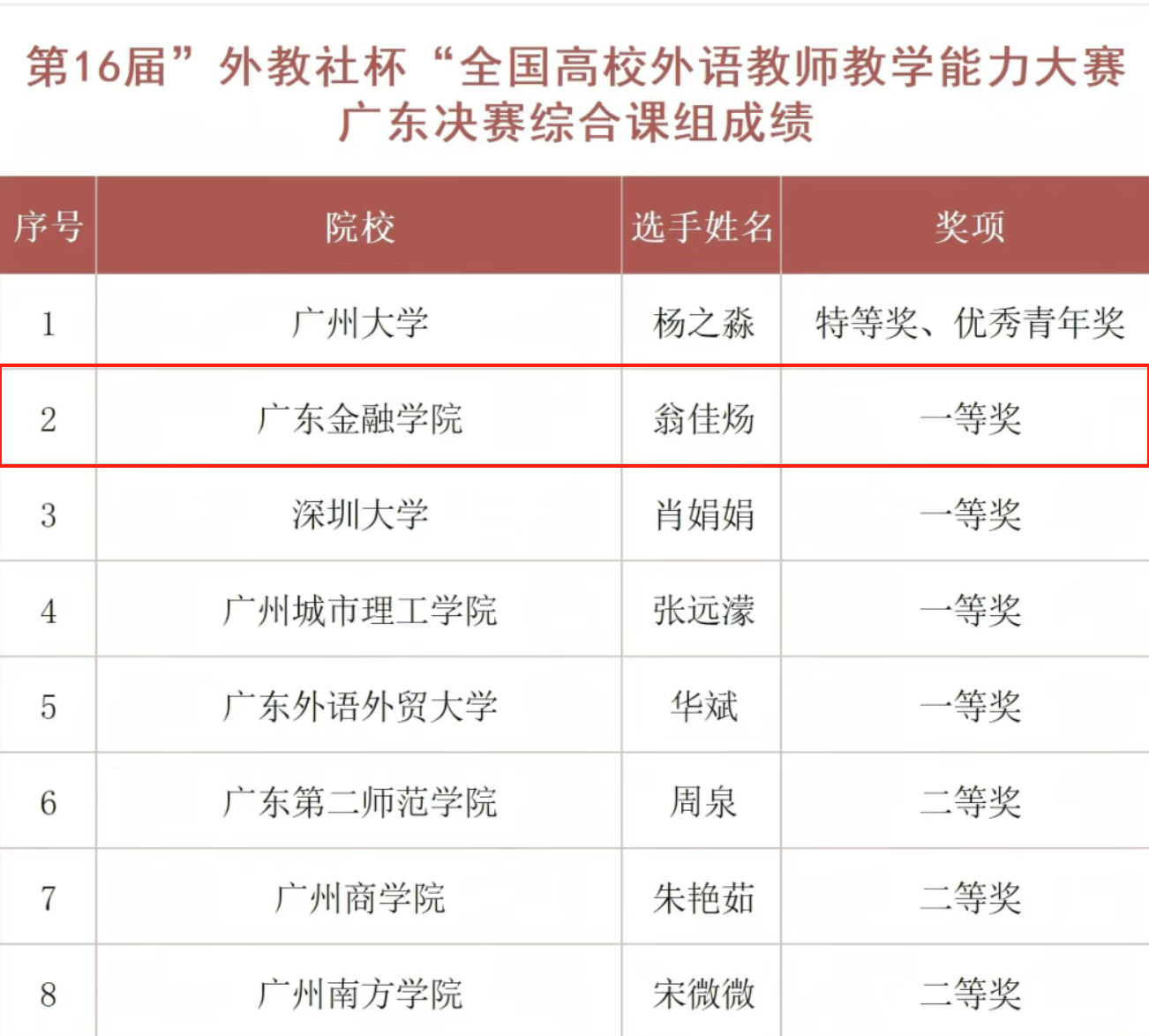 6月7日,第十六届“外教社杯”全国高校外语教师教学能力大赛(大学英语组)广东赛区决赛暨颁奖典礼在广州南方学院圆满落幕。广东金融学院外国语言与文化学院翁佳炀老师凭借扎实的教学功底与创新的教学设计,在综合课组激烈角逐中脱颖而出,勇夺综合课组一等奖第一名,为学校再添殊荣。