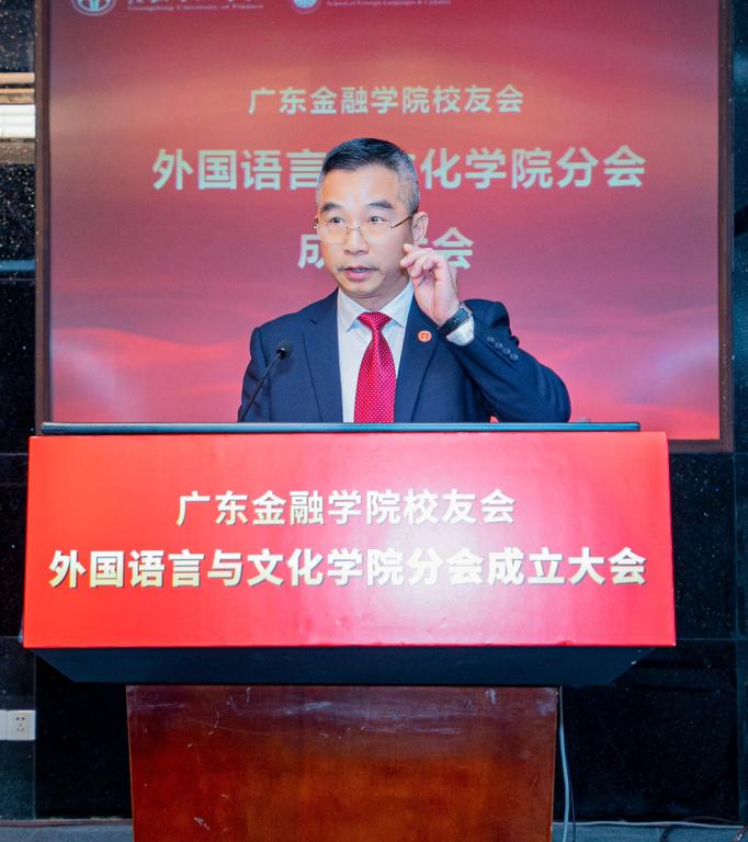 接着学校党委副书记、学校校友总会会长刘春阳致辞并讲话,他对校友会外文学院分会的成立表示热烈祝贺。同时他回顾了外文学院的发展历程与办学成就,肯定了广大外文校友在各行各业深耕实干、助力社会发展与母校建设的突出贡献,希望分会以成立为契机,搭建起校友与母校、校友与校友间沟通联动的坚实桥梁,凝聚校友力量赋能学院学科建设、人才培养与学术创新,助力学校高质量发展再谱新篇。
