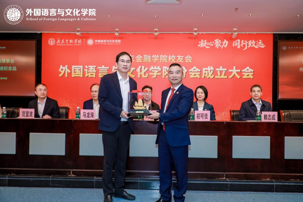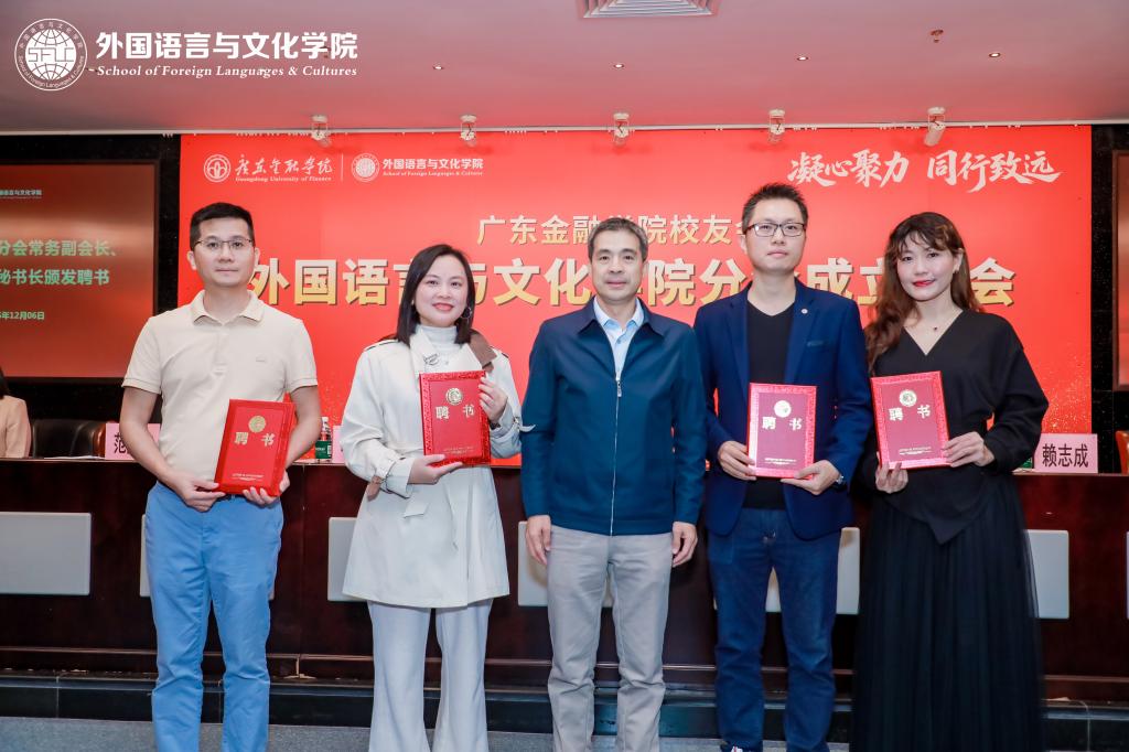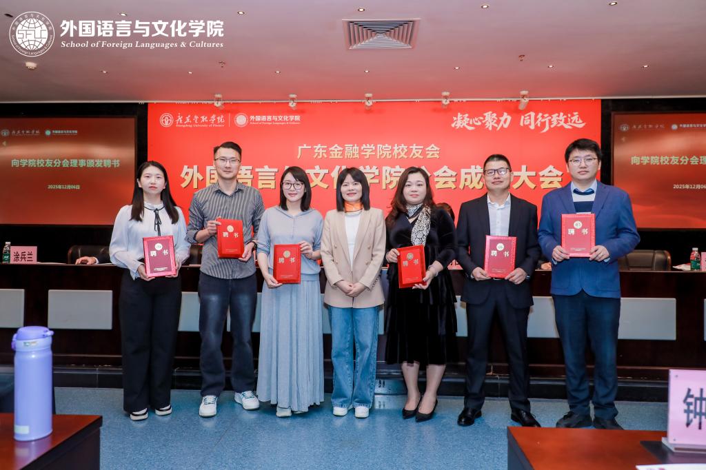 大会伊始,外文学院党委书记黄庆雄向与会校友汇报了分会筹备情况,介绍了分会组织架构搭建思路与后续工作规划,明确将以服务校友、反哺学院为核心,常态化开展校友交流、资源对接、成长帮扶等活动,打造有温度、有活力、有担当的校友家园。大会审议并通过了校友分会第一届理事会成员名单,学校校友办公室主任赖志成宣读《关于同意成立广东金融学院校友会外文学院分会的批复》,学校党委副书记刘春阳和副校长初可佳等领导嘉宾分别为分会会长、副会长、秘书长和理事颁发牌匾和聘书。