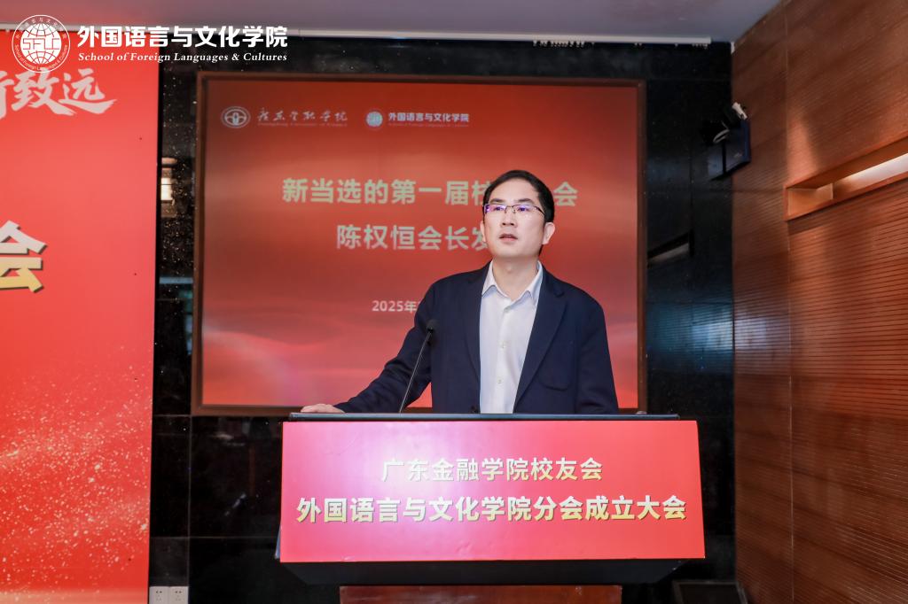 随后新任分会理事会陈权恒会长发言表示,将牢记使命职责,团结带领全体理事与广大校友,紧密联结母校与校友资源,传承学院优良学风,搭建合作共赢平台,助力校友成长进步的同时,为学院学科发展、人才培养、社会服务等方面提供更多支持,携手为母校事业发展贡献外文力量。